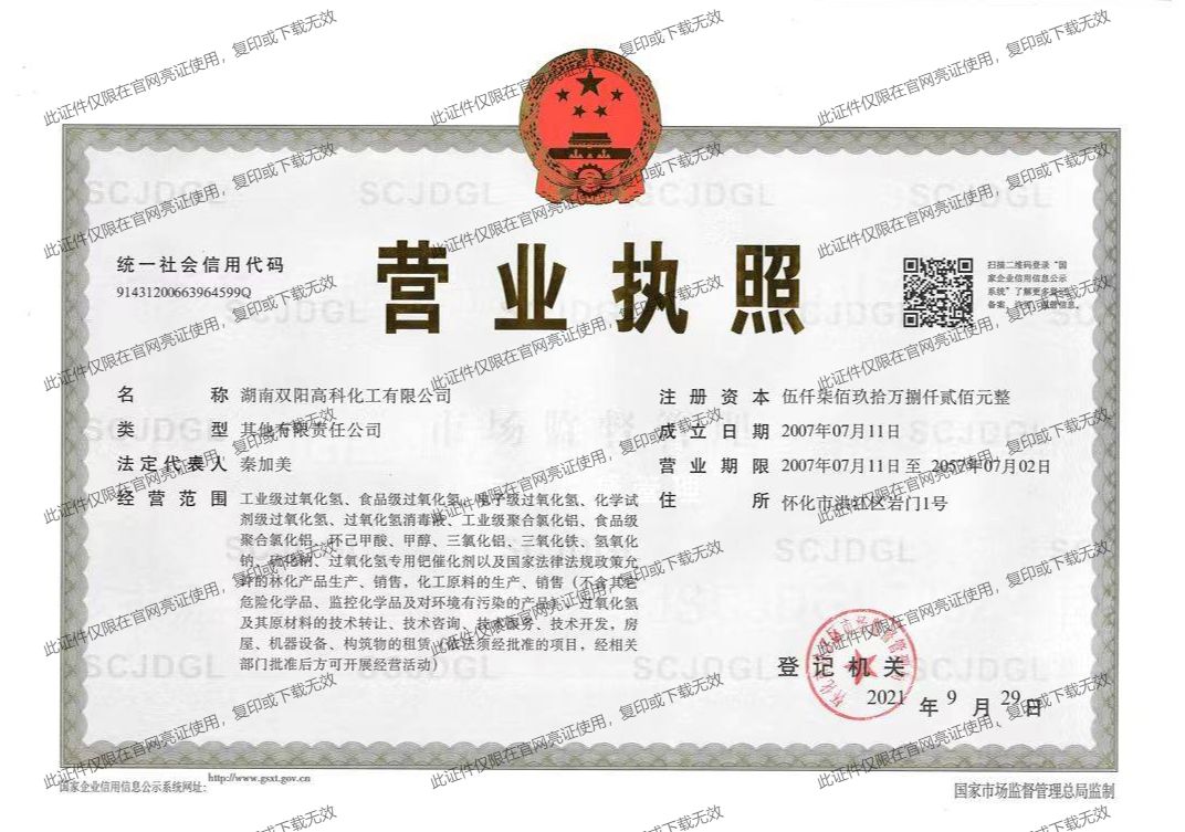 雙陽高科主要產品有工業級雙氧水、食品級雙氧水、電子級雙氧水、化學試劑級雙氧水、雙氧水消毒液、工業級聚合氯化鋁、食品級聚合氯化鋁、純度為99.5%的環己甲酸等產品,年產值過2億元,目前,公司產品內銷全國各地,外銷東南亞等國家和地區,擁有廣闊的國內與國際市場。
